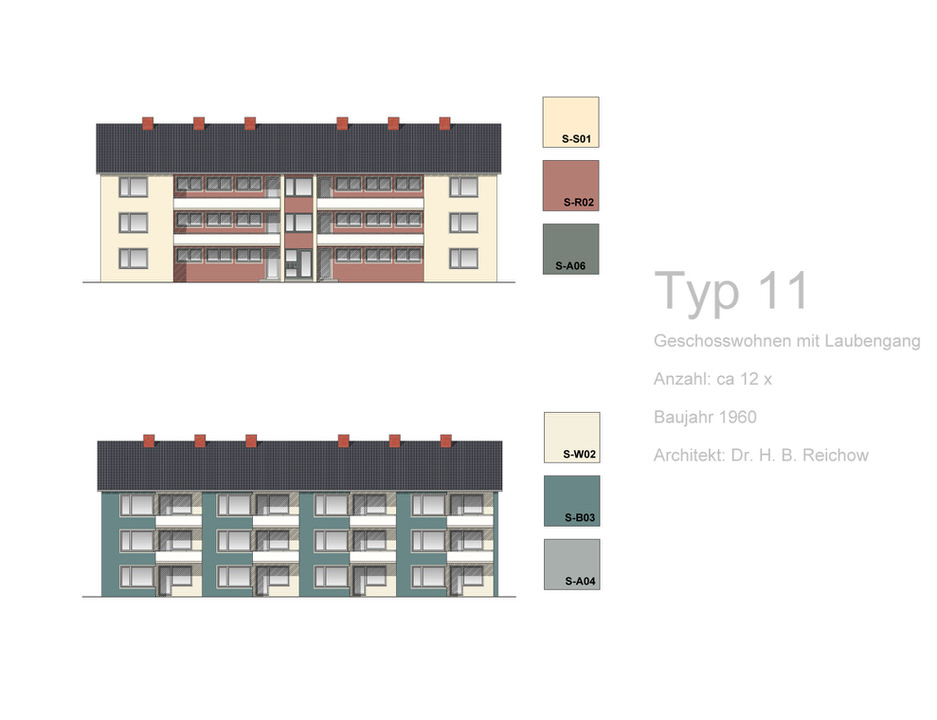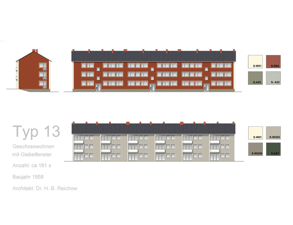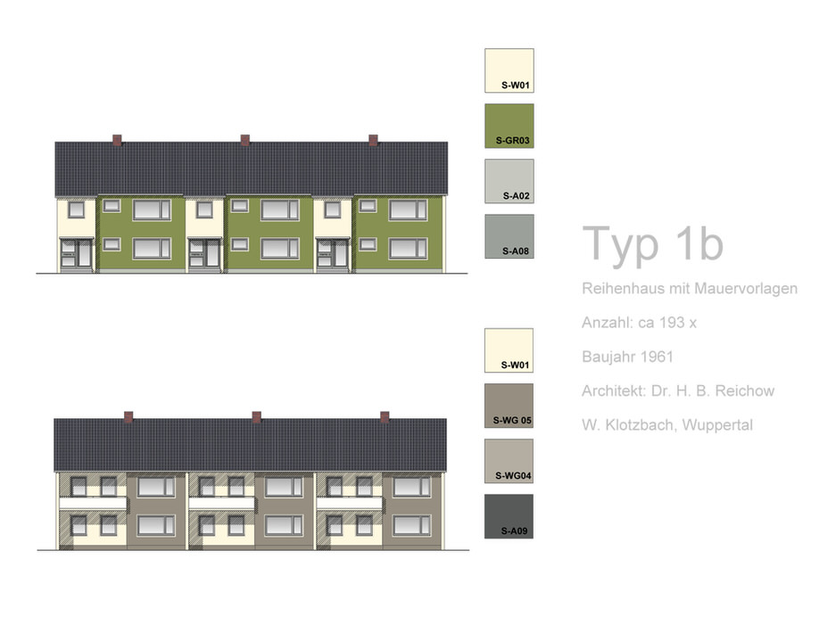 Neben den passenden Farben ist natürlich die Komposition der Farbtöne auf den Fassaden interessant für die harmonische Gesamtwirkung. Auch hierzu haben Peter Holst und Hanne Fink in ihrem Farbkonzept exemplarisch Entwürfe erarbeitet, z. B. für einige der Mehrfamilienhäuser und Reihenhaustypen der Sennestadt. Ein besonders prägendes Gestaltungsmittel, das schon die „Gründerväter“ um Reichow angewendet haben, findet sich hier wieder. Rund um die Fenster befanden sich früher durchgängig ca. 12 Zentimeter breite Faschen in strahlendem Weiß. Mit dieser einfachen Akzentuierung gelingt auch heute noch eine elegante grafische Gliederung der Fassaden, die Peter Holst als „festlich“ beschreibt. Weitere Bauelemente wie Balkonbrüstungen lassen sich, so die Empfehlung, im selben klaren Weiß fein absetzen.